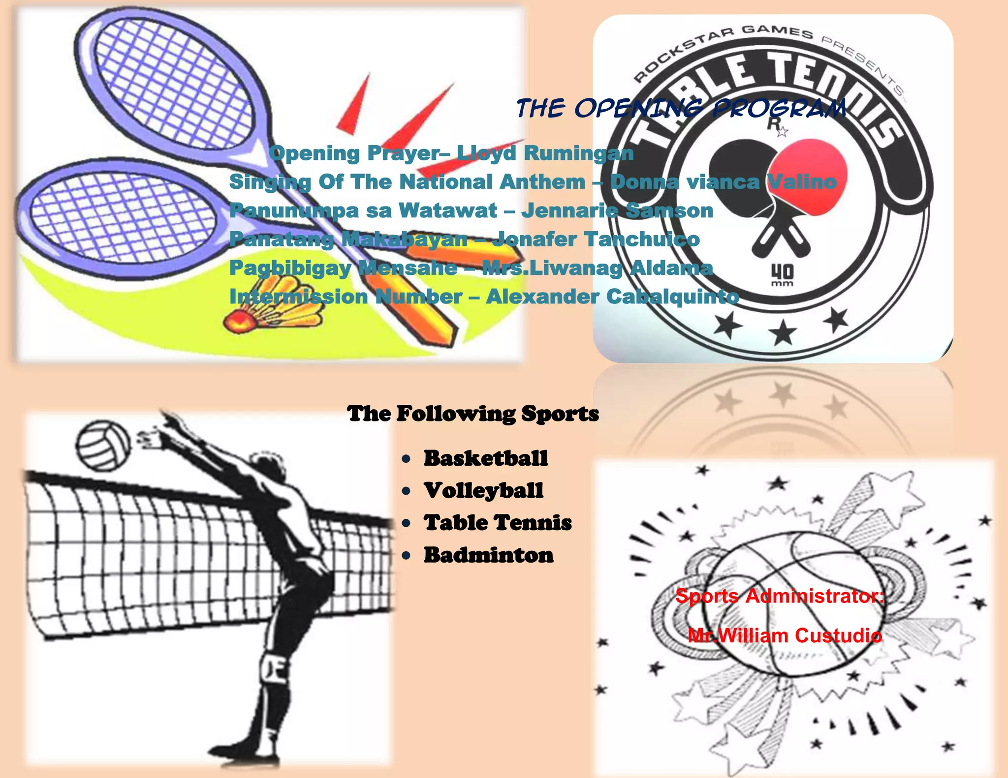 The opening program included an opening prayer, singing of the national anthem, pledges to the flag and country, and a message from Mrs. Liwanag Aldama. An intermission number was performed by Alexander Cabalquinto. The following sports events included basketball, volleyball, table tennis, and badminton overseen by sports administrator Mr. William Custudio.