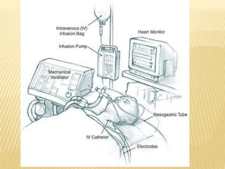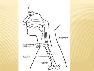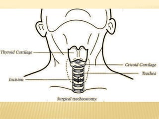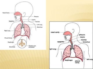 This document discusses acute respiratory failure and its causes, presentation, diagnosis, and treatment. It begins by differentiating pediatric and adult airway anatomy. Acute respiratory failure is then defined as the failure of gas exchange in the lungs. Causes can be extrapulmonary, such as brain or spinal cord issues, or intrapulmonary like infections or blood clots in the lungs. Assessment involves blood tests and imaging to identify the underlying problem. Treatment aims to support breathing and oxygenation through positioning, ventilation support, medications, and treating any underlying issues. Nursing priorities are optimizing gas exchange and managing complications.