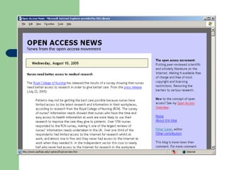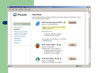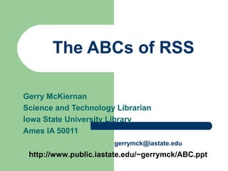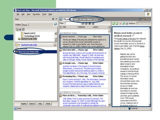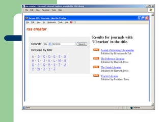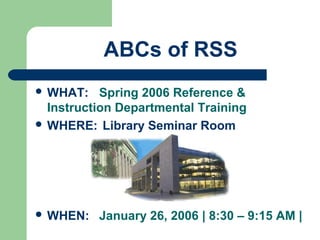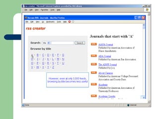The document provides an overview of RSS (Really Simple Syndication) and web feeds. It begins with an introduction to RSS and what it allows websites to do. It then covers the different types of RSS formats that exist and how users can subscribe to feeds using various feed readers or browsers. Examples are given of organizations, libraries, and sites that provide content via RSS feeds. The last part discusses how RSS can be used for things like announcements, databases, instruction, new books/journals, and more.