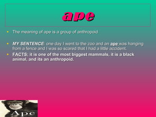 The document provides definitions and facts about various animals from A to Z. It includes definitions of animals like ape, brown bear, camel, dog, elephant, frog, giraffe, hippo, iguana, jaguar, kangaroo, lamb, monkey, nymph, owl, penguin, quarter horse, red start, swan, tiger, upland plover, vulture, wolf, xerus, yak, and zebra. For each animal, it provides a definition, a sample sentence using the animal, and 1-3 facts about that animal.