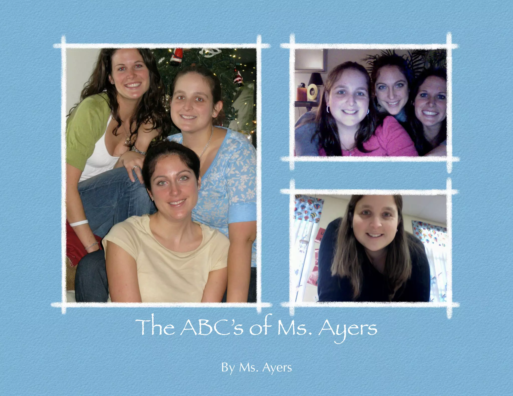 This book introduces Ms. Ayers to her students through an alphabet book where each letter represents something about her life. She shares that she loves apples, the Boston Red Sox, and has a cat named Fenway. Ms. Ayers also enjoys Disney, taking care of the earth, her family, going to places like the park and beach, ice cream, her sisters Julie and Jenny, kids, lions, Massachusetts where she was born, nighttime, the ocean, painting, being quirky, reading, sign language, tulips, vegetables, water, being excited, her students, the zoo, and played band instruments in school. Photos show her on her first day of kindergarten and sixth birthday as