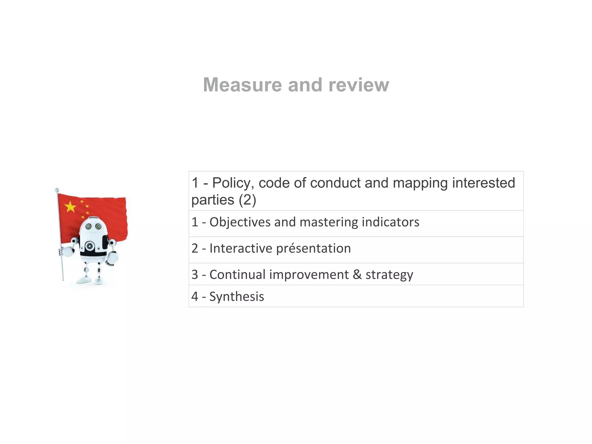 This document outlines steps for measuring and reviewing corporate social responsibility (CSR). It discusses mapping interested parties and their relationships. Objectives and key performance indicators (KPIs) should be specific, measurable, achievable, relevant and time-bound. Continual improvement involves implementing an action plan with objectives and KPIs, monitoring and controlling progress, and reporting KPI results to drive further actions. The CSR strategy should be integrated with the company's overall strategy. Risk management is also important for CSR. Creating shared value by enhancing competitiveness and advancing social conditions is discussed as a purpose of CSR.