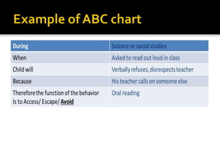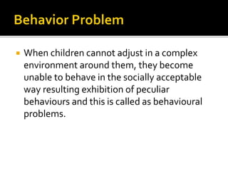 The document discusses behavioral problems in children, explaining their roots in the inability to adjust to complex environments and their functions, such as seeking attention or avoiding situations. It outlines steps for identifying and managing these behaviors through assessment, functional analysis, and intervention techniques. Specific strategies include reinforcement, shaping, prompting, and the use of therapeutic procedures tailored to improve adaptive behaviors and address undesirable actions.