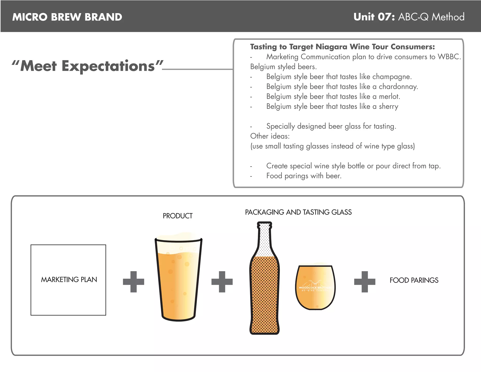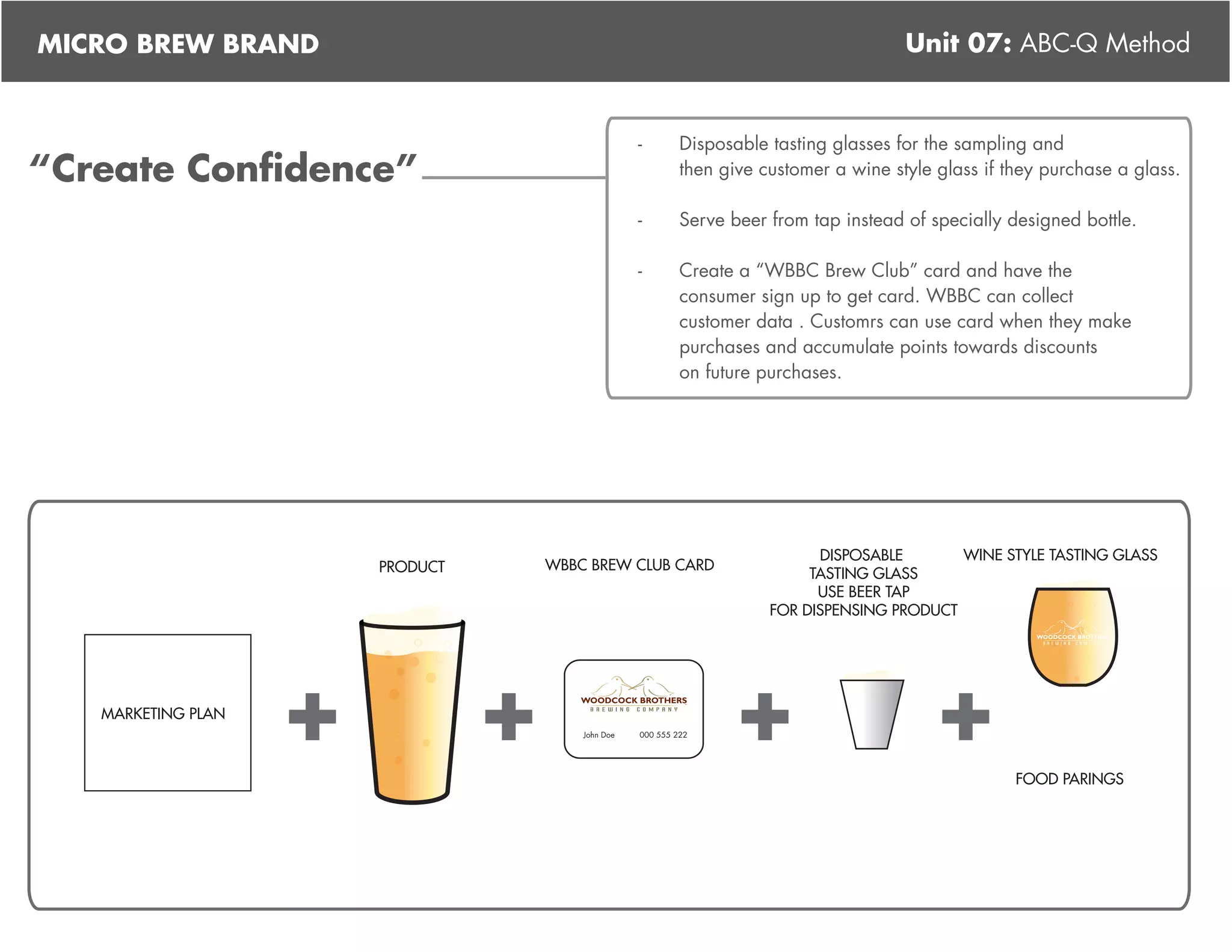 The document proposes several ideas for a micro brew brand to target wine tour consumers through Belgium-style beers that taste like different wines, including using specially designed tasting glasses, creating beer bottles or serving from taps, and offering food pairings; it also suggests creating a membership card program to collect customer data and offer discounts to drive repeat purchases. The document further develops the idea of a automated "Beer Station" that uses a card reader and dispenses multiple beer varieties and serving sizes while tracking consumer data.