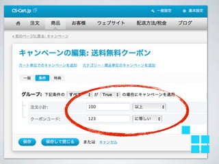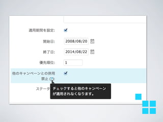 キャンペーン • 特定商品を割り引き(○○円以上で等) • 特定ユーザーへ割り引き提供 •