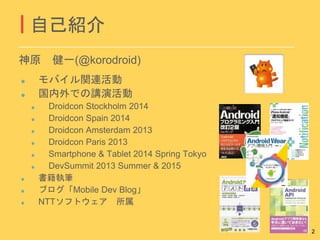 Spain 2014 Droidcon Amsterdam 2013 Droidcon Paris 2013 Smartphone & Tablet 2014 Spring Tokyo DevSummit 2013 Summer & 2015 書籍執筆 ブログ「Mobile Dev Blog」 NTTソフトウェア 所属 自己紹介 神原 健一(@korodroid) 2