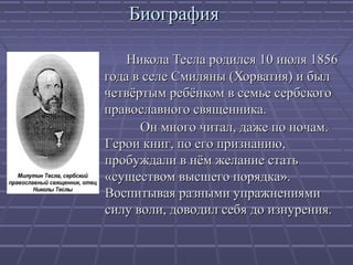 Никола Тесла (1856-1943) был выдающимся изобретателем, родившимся в Хорватии, который сделал значительные вклады в развитие переменного тока и беспроводной передачи энергии. После работы у Эдисона, Тесла получил финансовую независимость и продолжил свои исследования, создав несколько революционных устройств, включая резонансный трансформатор и электрические генераторы. Несмотря на его величие и более 300 патентов, Тесла остался недооцененным и малоизвестным по сравнению с другими изобретателями.