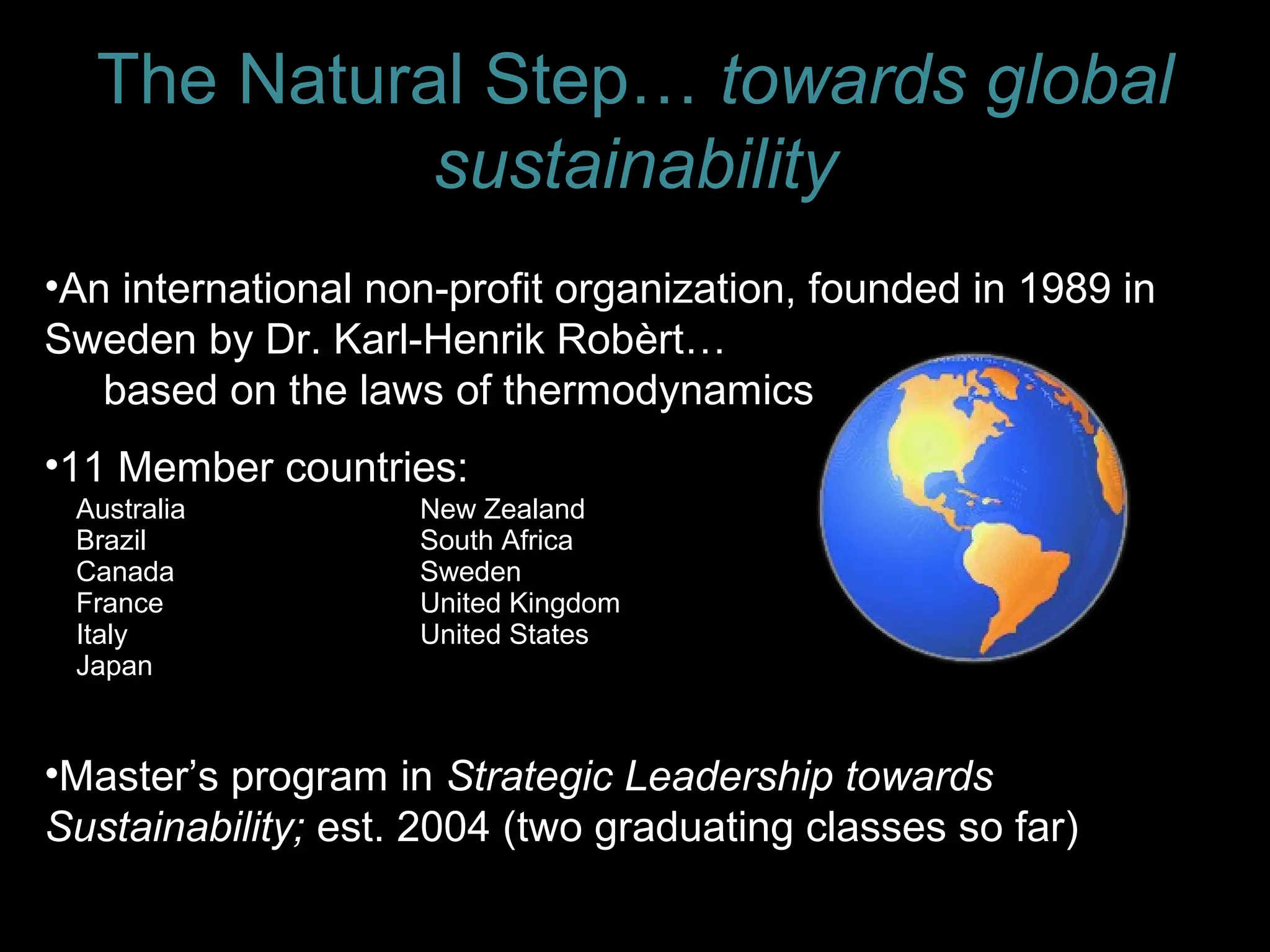 The Natural Step is an international non-profit organization founded in 1989 in Sweden to promote global sustainability based on the laws of thermodynamics. It has 11 member countries and offers a master's program in strategic sustainability leadership. The organization outlines four system conditions for sustainability: 1) nature is not subject to increasing concentrations of extracted substances, 2) nature is not subject to increasing concentrations of human-produced substances, 3) nature is not subject to physical degradation, and 4) human needs are met worldwide. The Natural Step uses an ABCD strategy of raising awareness, analyzing current practices, creating a vision for sustainability, and devising steps to achieve that vision through "backcasting from principles."