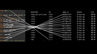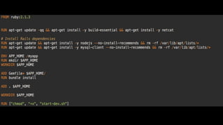 The document provides a detailed guide on setting up Docker environments, including a simple backend setup with Rails and MySQL, as well as containerizing Selenium tests using Docker. It discusses the advantages of utilizing Docker and Docker Compose to streamline the process of managing microservices and testing environments. It also includes commands and configurations necessary for running and managing Docker containers and images.