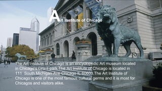 The document provides summaries of various places, events, and organizations in Chicago written by students in 3rd grade class 107. It includes summaries of the Art Institute of Chicago, the Black Hawk War, the Chicago Cubs baseball team, Mayor Daley, Edgewater neighborhood, Fort Dearborn, the Great Chicago Fire, Hayt Elementary School, ice hockey, Jean Baptiste Point DuSable, Kane County, Lake Michigan, the Museum of Science and Industry, Navy Pier, Catherine O'Leary, the Palmer House Hotel, Quaker Oats, the Chicago River, the Shedd Aquarium, the Willis Tower, Union Station, Vernon Hills, the Chicago White Sox, Saint Xavier University, the Chicago Yacht