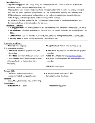 Abdelrahman Abdallah Abdelfatah Elskhawy is seeking a challenging opportunity in digital design and embedded systems. He has a bachelor's degree in electronics and communication from Cairo University, where he graduated with excellent grades. His graduation project involved designing a 64-bit floating point adder/subtractor using Verilog. He has work experience at Edge Technology developing systems using microcontrollers and ARM boards. He has strong skills in Verilog, VHDL, embedded C, and CAD tools like Cadence and Quartus.