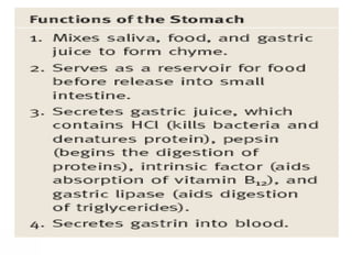 1) The document discusses the processes of mastication, deglutition, digestion in the stomach and small intestine. It describes the stages of swallowing and peristalsis that move food through the esophagus.