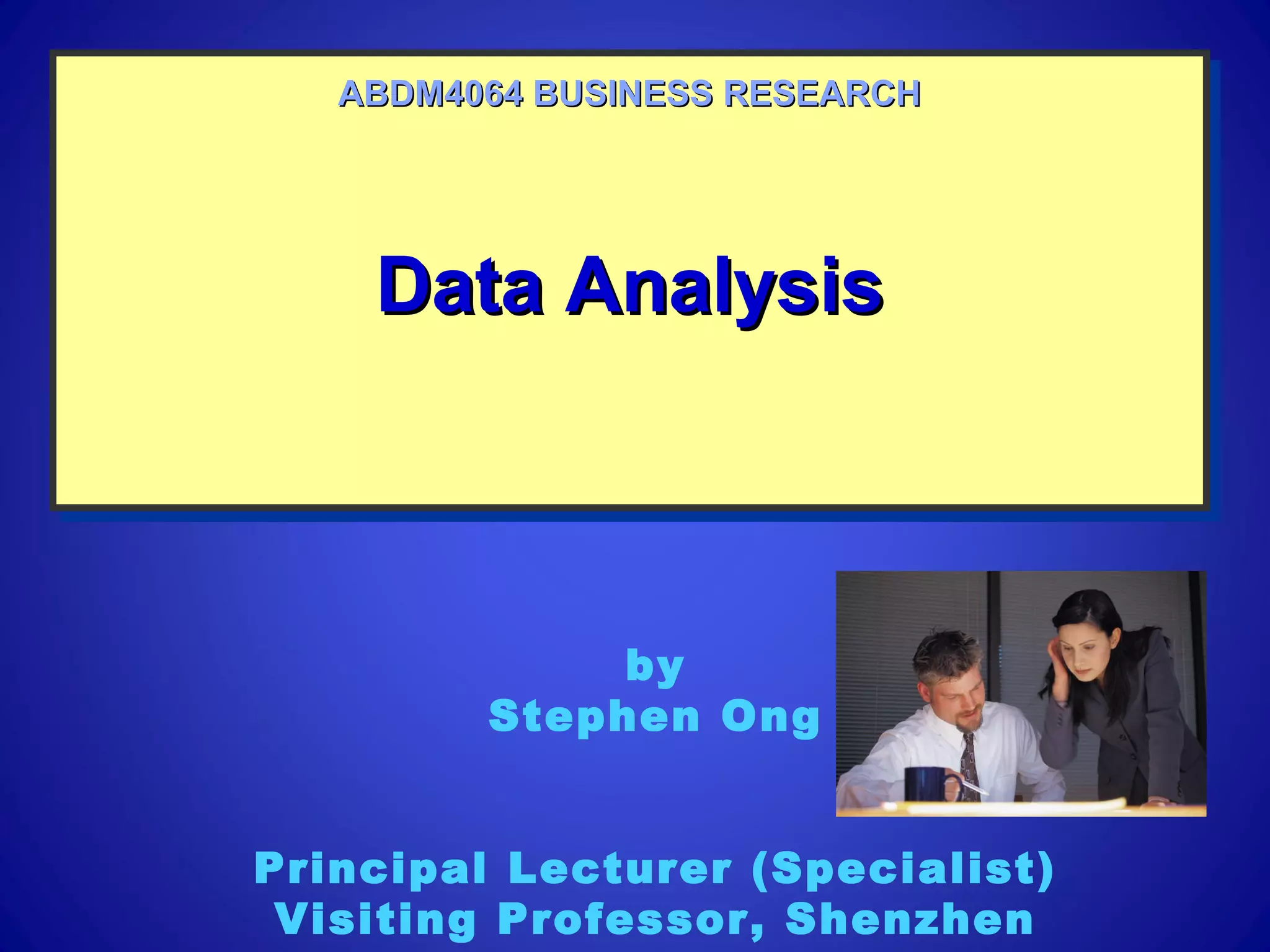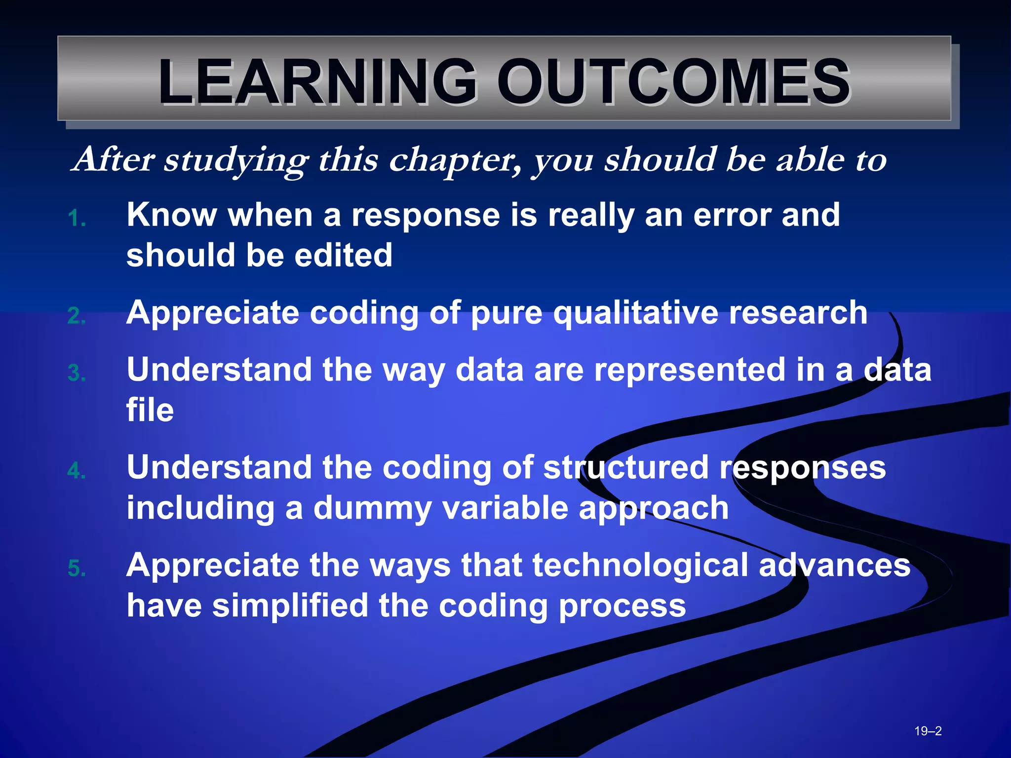 The document outlines 31 learning outcomes for data analysis. It discusses key concepts in data analysis including editing raw data, coding qualitative responses, constructing data files, and descriptive statistical analysis. The goal is for students to understand processes for preparing and summarizing data including editing, coding, and descriptive statistics.