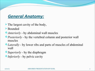 3. Major organs include the stomach, small and large intestines, liver, pancreas, spleen and kidneys. The peritoneum lines the walls and covers some organs.