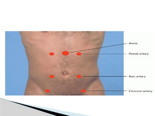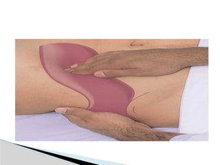 The document outlines a comprehensive approach to abdominal assessment, detailing the anatomical regions, examination techniques, and indications for various conditions related to abdominal pain. It includes descriptions of palpation techniques, auscultation methods, and specific tests for conditions like ascites and appendicitis. The text emphasizes the importance of patient positioning, comfort, and systematic examination to ensure accurate diagnosis.