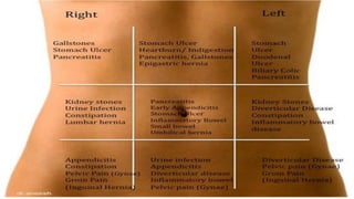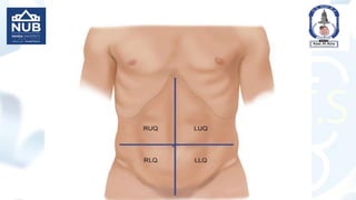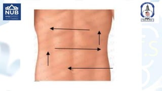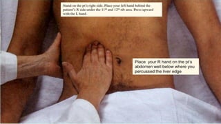 This document provides guidance on performing an abdominal examination through inspection, palpation, percussion, and auscultation. It describes the techniques for superficial and deep palpation of the abdomen while assessing for organomegaly. Specific instructions are given for palpating the liver and spleen, including common examination methods to determine size, edge, consistency, surface, tenderness, and pulsation. Causes of apparent or tender hepatomegaly and huge splenomegaly are also listed.