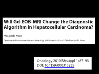 This document discusses the current approach for diagnostic imaging of small hepatocellular carcinoma (HCC) in patients with liver cirrhosis using gadoxetic acid (Primovist) enhanced magnetic resonance imaging (MRI) and diffusion weighted imaging (DWI). It summarizes that the combined use of Primovist MRI and DWI provides high diagnostic accuracy and sensitivity, particularly for detecting HCC lesions smaller than 2cm. This approach can image the step-wise progression of hepatocarcinogenesis by assessing vascularity, hepatocyte function, and cell density. The summary highlights that while Primovist MRI alone has high sensitivity, it has compromised specificity, but combining it with DWI increases specificity by differentiating HCC from