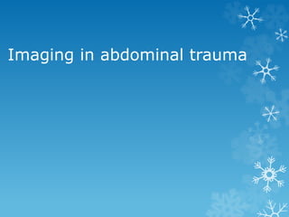 This document discusses imaging for abdominal trauma. It begins by outlining the mechanisms and classifications of abdominal injury. FAST ultrasound is described as a rapid way to detect free fluid. CT is outlined as the preferred imaging method for evaluation of abdominal trauma. Specific injuries to organs like the spleen, liver, pancreas, and kidneys are then reviewed. Features of each injury on CT are provided along with grading scales. Management considerations for different injuries are also mentioned.