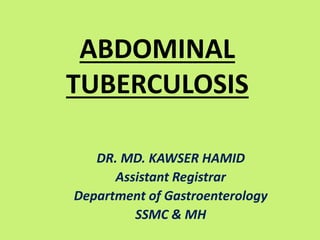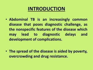 1. Abdominal tuberculosis poses a diagnostic challenge due to its non-specific symptoms which can lead to delays in diagnosis and complications. It commonly involves the lymph nodes, peritoneum, and gastrointestinal tract like the ileocecal region.