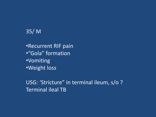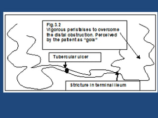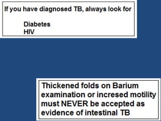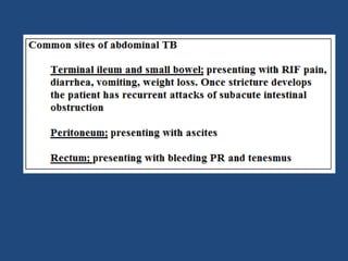 Abdominal tuberculosis (TB) is a significant health issue in the developing world, often associated with immunocompromised individuals, particularly those with HIV/AIDS. It primarily affects the gastrointestinal tract, especially the ileocecal area, presenting with non-specific abdominal pain, weight loss, and complications such as intestinal obstruction. Diagnosis typically requires imaging studies and can involve empirical treatment; surgical intervention is necessary for symptomatic strictures.