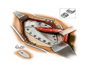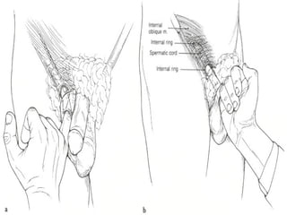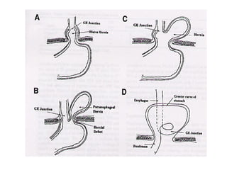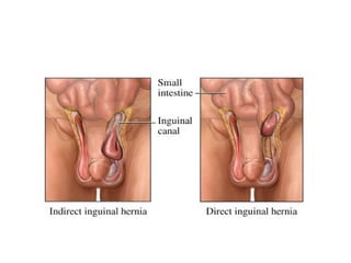 Abdominal wall herniae are classified as reducible, irreducible, or strangulated. Hernias contain a sac protruding through a defect in the abdominal wall and may contain organs like the intestines, omentum, or bladder. Common hernia types are inguinal, femoral, umbilical, incisional, and hiatal. A hernia exam evaluates for cough impulse, reducibility, location above the pubic tubercle, and differentiates direct from indirect inguinal hernias. Surgical repair techniques include open anterior and posterior approaches, tension-free repairs using mesh, and laparoscopic procedures. Complications include incarceration, strangulation, recurrence, infection, and nerve damage