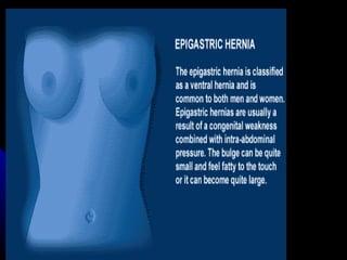 The document discusses various abdominal wall defects including hernias. It describes the anatomy and embryology of the abdominal wall and covers different types of hernias such as umbilical, epigastric, incisional and congenital defects. Diagnosis and repair techniques involving primary closure or mesh are discussed for each type of hernia.