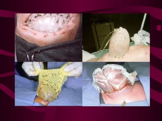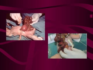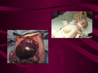 This document discusses various abdominal wall defects in infants. It describes omphalocele, where abdominal organs protrude into a sac through a defect in the abdominal wall near the umbilicus. Gastroschisis is defined as a defect to the right of the umbilicus where intestines directly eviscerate. Incidence, pathophysiology, clinical findings, associated anomalies, and treatment approaches like primary closure or staged closure using a silo are reviewed for each condition. Other rare defects discussed include umbilical hernia, prune belly syndrome, bladder exstrophy, pentalogy of Cantrell, and Beckwith-Wiedemann syndrome. Key differences between omphalocele and gastroschis