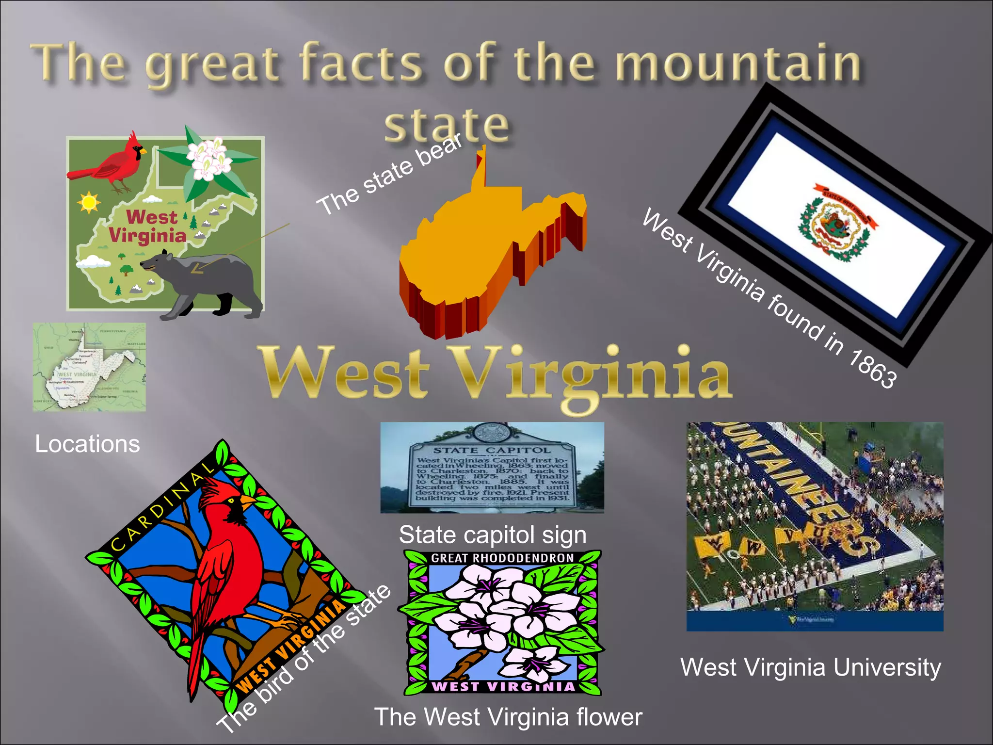 The state bird of West Virginia was found in 1863 and the state bear was also designated. The state flower of West Virginia is the rhododendron, which grows in many locations throughout the state. West Virginia University and the state capitol building are two notable landmarks.