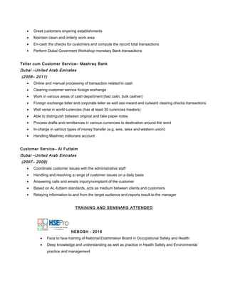 This document provides a summary of Abdullah Hassan Abdullah Ali's personal and professional details. It includes his contact information, objective, work experience in cashier roles at Dubai Government Workshop and Mashreq Bank, as well as customer service experience at Al Futtaim. It also outlines his education background, skills, and languages. His work experience demonstrates skills in cash handling, customer service, and maintaining accurate financial records. He is seeking a professional role that allows him to utilize his skills and experience in a challenging environment.