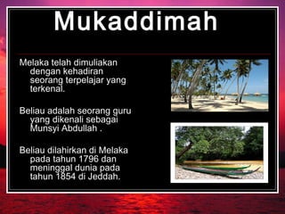 Munsyi Abdullah, seorang guru terpelajar dari Melaka, dilahirkan pada tahun 1796 dan meninggal dunia pada tahun 1854 di Jeddah. Beliau dikenali dengan penulisan 'Hikayat Abdullah' dan merupakan penulis Melayu pertama yang menulis dalam gaya yang berbeza daripada tradisi sastera Melayu. Munsyi Abdullah juga berkhidmat sebagai pentafsir dan jurutulis untuk Sir Stamford Raffles serta menyokong penerbitan alkitab dalam bahasa yang berbeza.