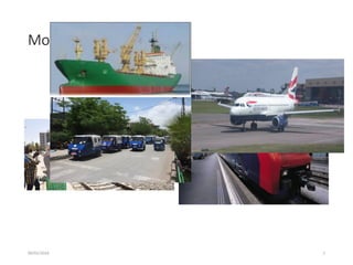 The document covers transport geography, defining it as the study of the mobility of people, freight, and information along with the spatial organization involved. It details various aspects including transport systems, modes, principles, accessibility, and the historical evolution of transportation technologies, emphasizing the importance of transport in overcoming spatial barriers and fulfilling mobility demands. Additionally, it discusses concepts like transportability, derived demand, and the infrastructural requirements essential for effective transportation networks.
