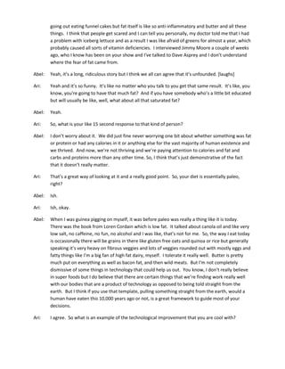 Abel describes how he became known as the "Fat Burning Man" after firing his doctor and experimenting on himself to improve his health. He lost 20 pounds in 40 days by following advice from medical journals, bodybuilding forums, and other sources. This led him to start a podcast and write books to help others learn how to lead a healthy lifestyle. He discusses that his diet is not strictly paleo but emphasizes whole foods like vegetables, eggs, fatty meats and dairy. He also embraces some technological improvements like MCT oil that provide energy benefits. Abel stays active through lifting weights, pull ups, sprints, and Krav Maga martial arts training while emphasizing an overall lifestyle of movement rather than
