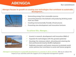 Abengoa is dedicated to sustainable development through innovative technology solutions in energy and environmental sectors, including renewable energy, biofuels, and desalination. In 2013, the company reported significant growth with sales of €7.356 billion and EBITDA of €1.365 billion, supported by a strong focus on research and development. Abengoa actively engages in corporate social responsibility, investing in initiatives that promote environmental management and community support.
