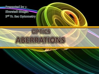 This document discusses various types of optical aberrations that occur when light passes through a lens. It describes six main types of aberrations: chromatic aberration, spherical aberration, marginal astigmatism, coma, curvature of field, and distortion. For each aberration, it explains the visual effects, causes, importance for eyeglass lens design, and potential corrections. The document provides an in-depth overview of how different lens properties and light behaviors can lead to imperfect focusing and imaging within the eye.
