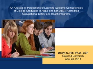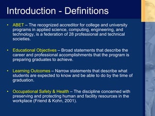 This document provides an introduction and background to a study analyzing perceptions of learning outcome competencies of college graduates from occupational safety and health programs that are ABET accredited versus non-ABET accredited. The study aims to test the hypothesis that ABET accreditation leads to higher perceptions of learning outcomes. The document outlines the literature review, study methodology using a survey questionnaire, and research questions regarding differences in perceptions of learning outcomes, feedback on programs, advice to students, and professional development.