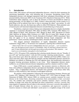 The document analyzes the influence of powerful independent directors on shareholder value, finding that their social network power correlates positively with higher valuations. Sudden deaths of such directors lead to decreased shareholder value, indicating their importance in governance. The study proposes that more powerful directors enhance monitoring and accountability, resulting in fewer detrimental M&A bids and improved CEO performance metrics.