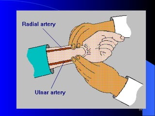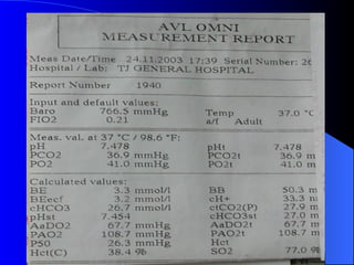 This document summarizes arterial blood gas (ABG) analysis, including indications, sample collection techniques, measurement interpretations, and compensation mechanisms. It describes how ABG tests are used to assess respiratory and acid-base status by measuring pH, pCO2, pO2, HCO3, and other values. The radial artery is most commonly used for puncture due to low risk of complications. Interpretation of ABG values indicates acid-base and oxygenation status, and whether the lungs or kidneys are compensating. Normal ABG ranges are also provided for reference.