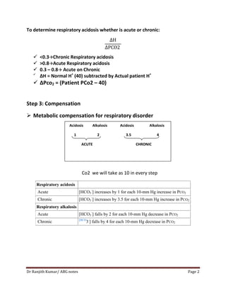 This document provides instructions for interpreting arterial blood gas (ABG) results in 3 steps: 1) Determine pH and use it to identify acidosis or alkalosis. 2) Use pH and pCO2 values to classify acidosis or alkalosis as respiratory or metabolic, and as acute or chronic. 3) Examine bicarbonate levels to see if there is compensation for respiratory or metabolic disorders, and how to classify the compensation as acute or chronic. The document also provides formulas for calculating changes in bicarbonate and pCO2 levels during compensation, and discusses how to identify and classify mixed disorders.
