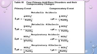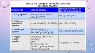 This document provides normal ranges for arterial blood gas (ABG) values including pH, partial pressure of carbon dioxide (Paco2), partial pressure of oxygen (Pao2), oxygen saturation (Sao2), and bicarbonate (HCO3). It also defines the anion gap formula as sodium minus chloride plus bicarbonate, states the normal anion gap is 12 mmol/L, and notes hyperchloremia can cause changes in the anion gap.