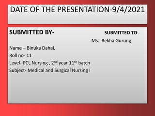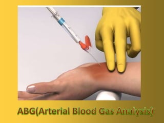The document presents a detailed overview of arterial blood gas (ABG) analysis, including its definition, purposes, indications, and procedure for conducting the test. It outlines the components of ABG, their normal values, and potential complications, as well as methods for interpreting results related to acid-base imbalances. Additionally, it provides references for further reading and guidelines for ensuring proper technique during the procedure.