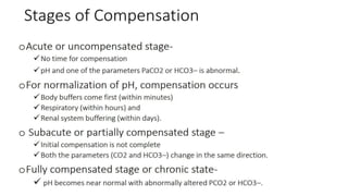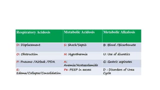 This document provides information on arterial blood gas (ABG) interpretation for medical professionals and trainees. It discusses the indications, equipment, and procedures for collecting an ABG sample. Key steps in the collection process include preparing the patient, selecting an appropriate artery site, and applying pressure after puncture. The document then covers interpreting ABG results through a stepwise approach considering pH, acid-base balance, compensation, oxygenation status, and identifying simple vs mixed disorders. Common abnormal values and their implications are presented. Examples of interpreted ABG reports are provided to demonstrate the evaluation process.