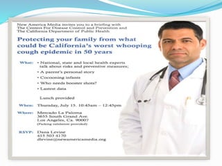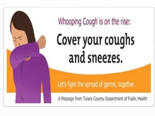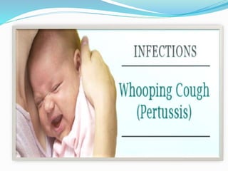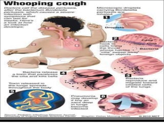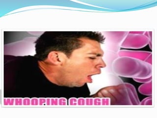 Pertussis, also known as whooping cough, is a highly contagious respiratory disease caused by the bacterium Bordetella pertussis. It is characterized by severe coughing fits that can end in a "whooping" sound. It primarily affects children under 5 years old. The disease spreads through respiratory droplets when an infected person coughs or sneezes. It can be prevented through active immunization with the DPT vaccine, which is recommended in 5 doses for children up to age 6.