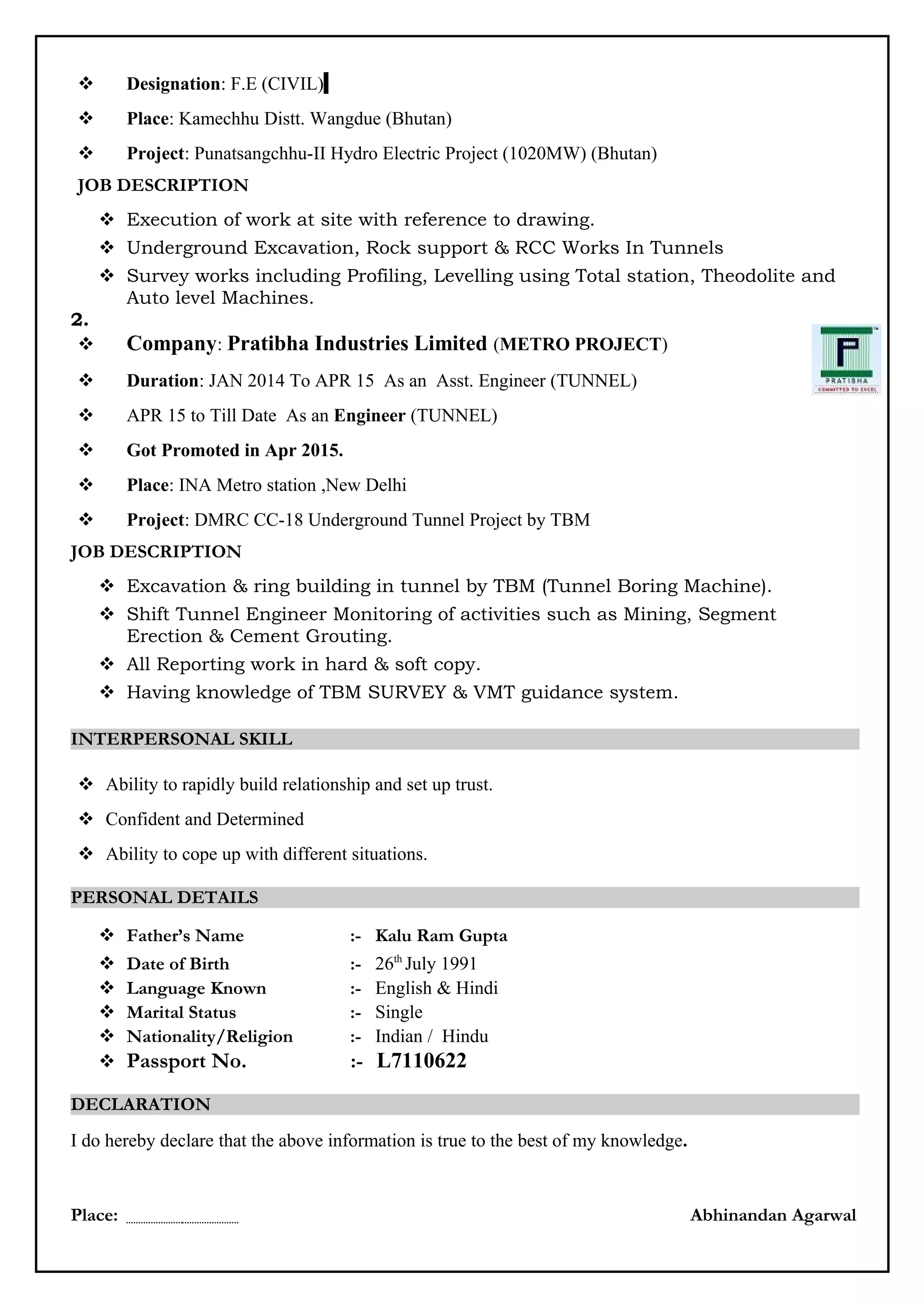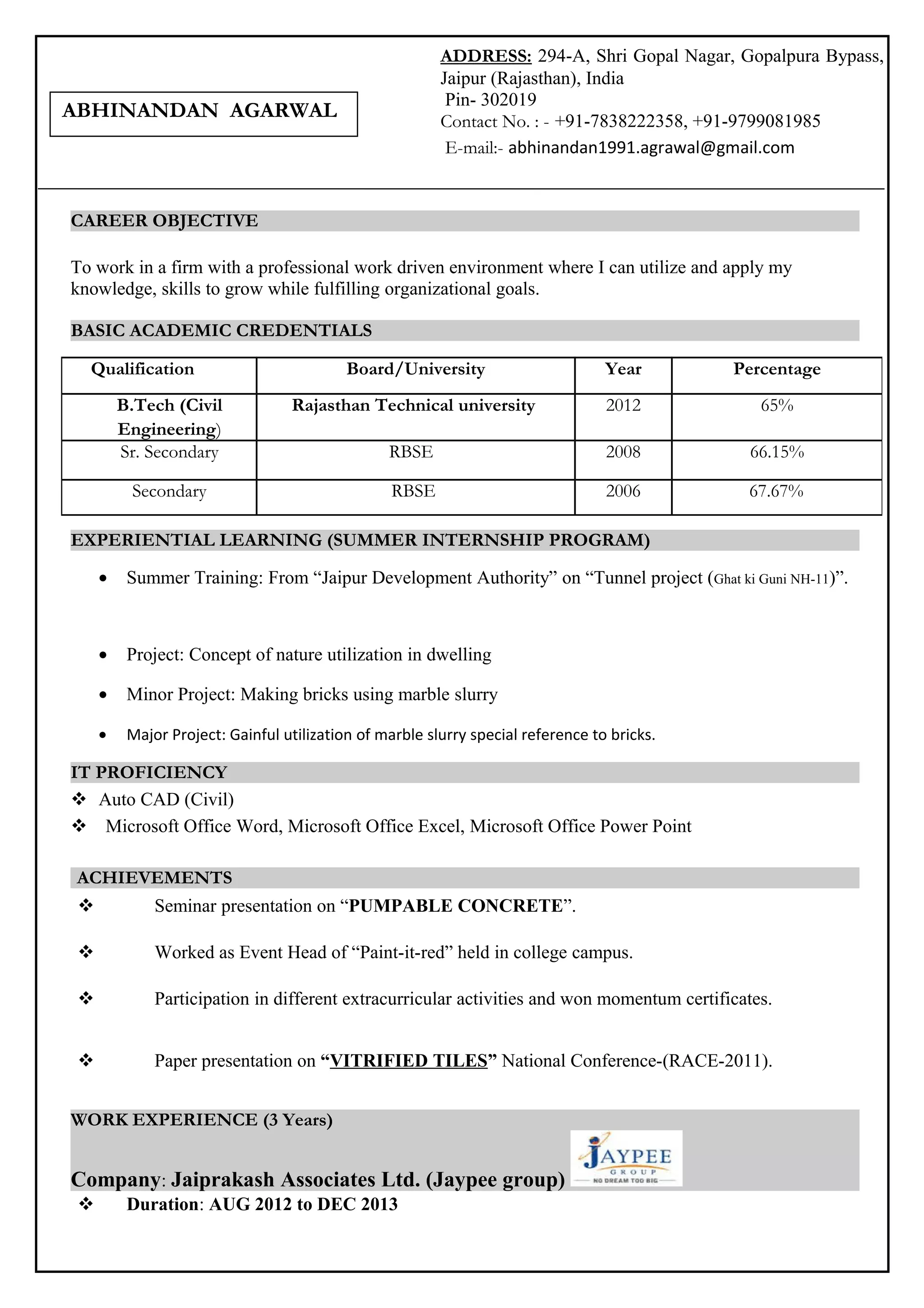 This document is a resume for Abhinandan Agarwal. It summarizes his educational and professional background. He has a B.Tech in Civil Engineering from Rajasthan Technical University. For experiential learning, he completed summer internships focusing on tunnel projects. Professionally, he has over 3 years of experience working on tunnel construction projects in Bhutan and India for major companies. His roles have included tunnel engineering, excavation, construction, and project monitoring and reporting. He seeks to apply his knowledge and skills in a professional work environment.