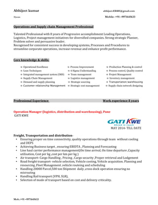 Abhijeet Kumar has over 8 years of experience in operations and supply chain management, holding positions such as Operations Manager at GATI KWE and Associate Manager at Vedanta Resources PLC, where he has led initiatives in logistics, procurement, inventory management, and process improvement. He holds a PGDM from MDI Gurgaon and a Bachelor's in Chemical Engineering, and is seeking new opportunities to apply his expertise in operations and supply chain optimization.