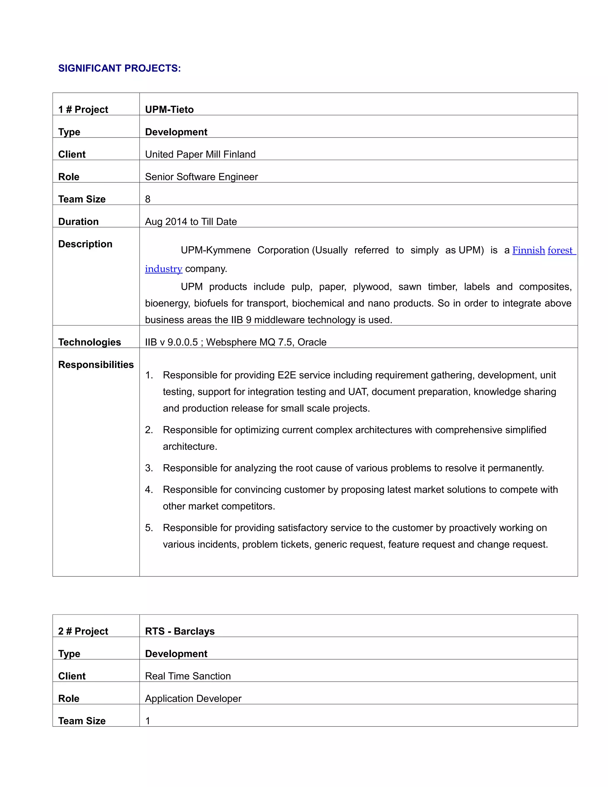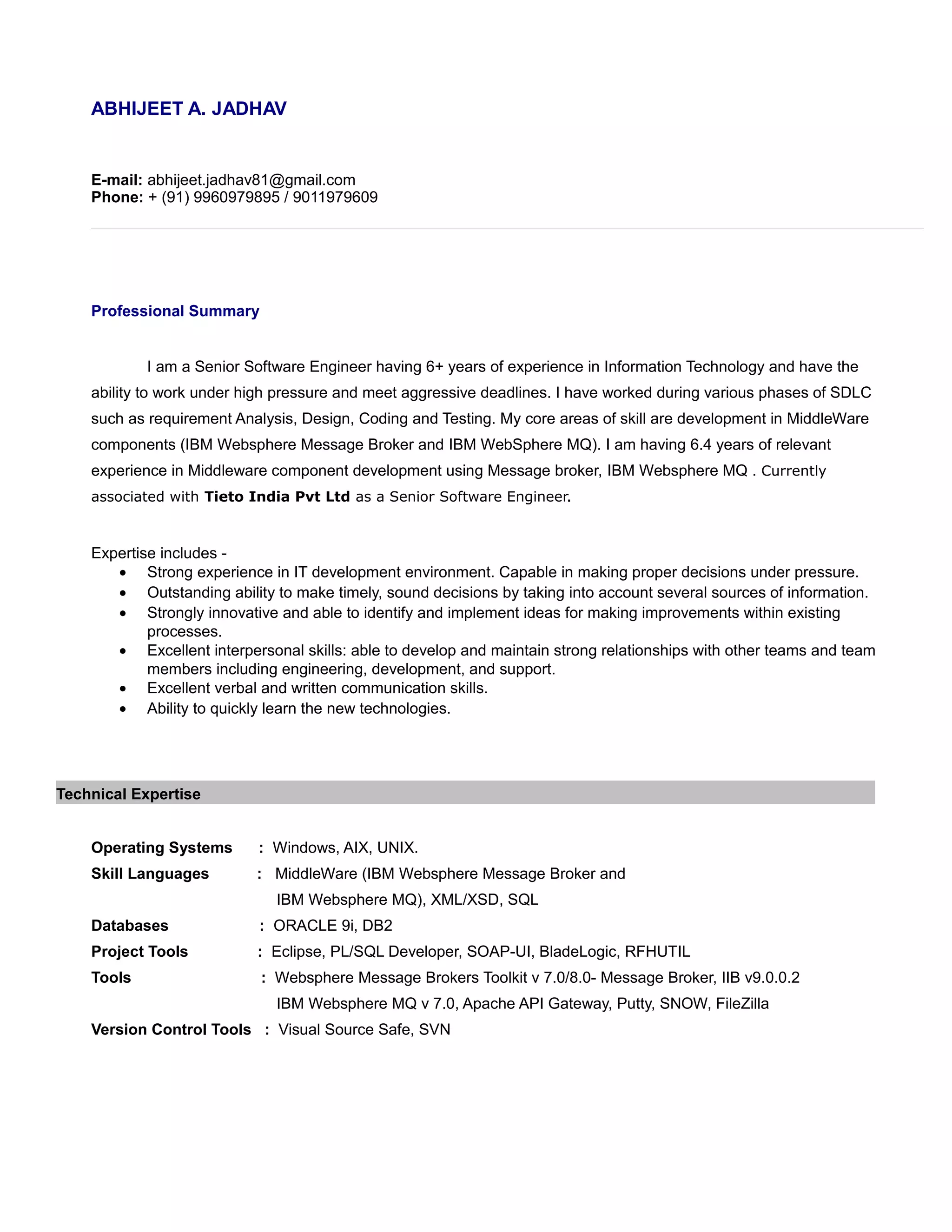 Abhijeet Jadhav is a senior software engineer with over 6 years of experience developing middleware components like IBM Websphere Message Broker and IBM WebSphere MQ. He has worked on projects for clients like United Paper Mill Finland, Barclays, and RAKBank UAE, developing services for tasks like integrating business areas, online screening against sanction lists, and interfaces between legacy systems and a new core banking system. His skills include message broker development, WebSphere MQ, XML, SQL, and tools like Eclipse and SVN. He is currently with Tieto India as a senior software engineer.