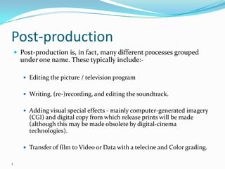 The document discusses various post-production processes like editing, sound editing, visual effects, and compositing. It describes the differences between visual effects and special effects, with visual effects referring to digital post-production techniques while special effects involve on-set mechanical or optical techniques. The document also provides examples of different visual effects techniques like chroma keying, rotoscoping, wire and rig removal, camera tracking, and matchmoving.