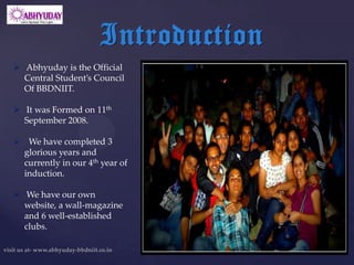 Abhyuday is the official student council of BBDNIIT, formed in 2008 to aid student development. It has 6 clubs and organizes various cultural, technical and literary events on campus and competes at other colleges. The council is led by a General Secretary and Additional General Secretary and has two faculty mentors. It has been successful in competitions, winning prizes in drama, dance, music and literary events. The council also publishes a wall magazine and has a website to share updates.