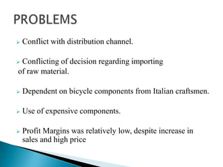 The document discusses a bicycle manufacturing company that targets the high-end bicycle market with a focus on quality and differentiation. The company promotes its brand through parties and trade shows instead of advertising. This niche strategy led to a 25% increase in bicycle sales despite the global recession. However, the company faces conflicts with its distribution channel and decisions around importing raw materials. It is also dependent on expensive, Italian-made components and has relatively low profit margins despite higher prices and increased sales. It is recommended that the company shift to machine-made components, source lower-cost components from countries like China, build its own brand image, and import materials directly to increase sales and profits.