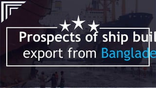 The document discusses the prospects of shipbuilding exports from Bangladesh. It provides a history of shipbuilding in Bangladesh dating back to the 15th century. It outlines the country's potential advantages in shipbuilding like low-cost skilled labor. However, challenges also exist such as a lack of raw materials and backward technology. With support from the government in terms of policies and infrastructure development, Bangladesh could become a leading ship exporter, capitalizing on the growing global demand for ships and its competitive advantages in labor costs and productivity.