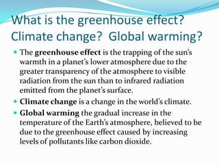 The greenhouse effect traps heat in the lower atmosphere due to gases like carbon dioxide, causing global warming and climate change over time. Burning fossil fuels is the primary cause of rising CO2 levels. Consequences of unchecked global warming include rising sea levels flooding coastlines, more extreme weather, and threats to food and natural resources. While some argue the causes and effects are uncertain, the document's authors believe global warming poses serious risks and requires action like transitioning to renewable energy and reducing greenhouse gas emissions.